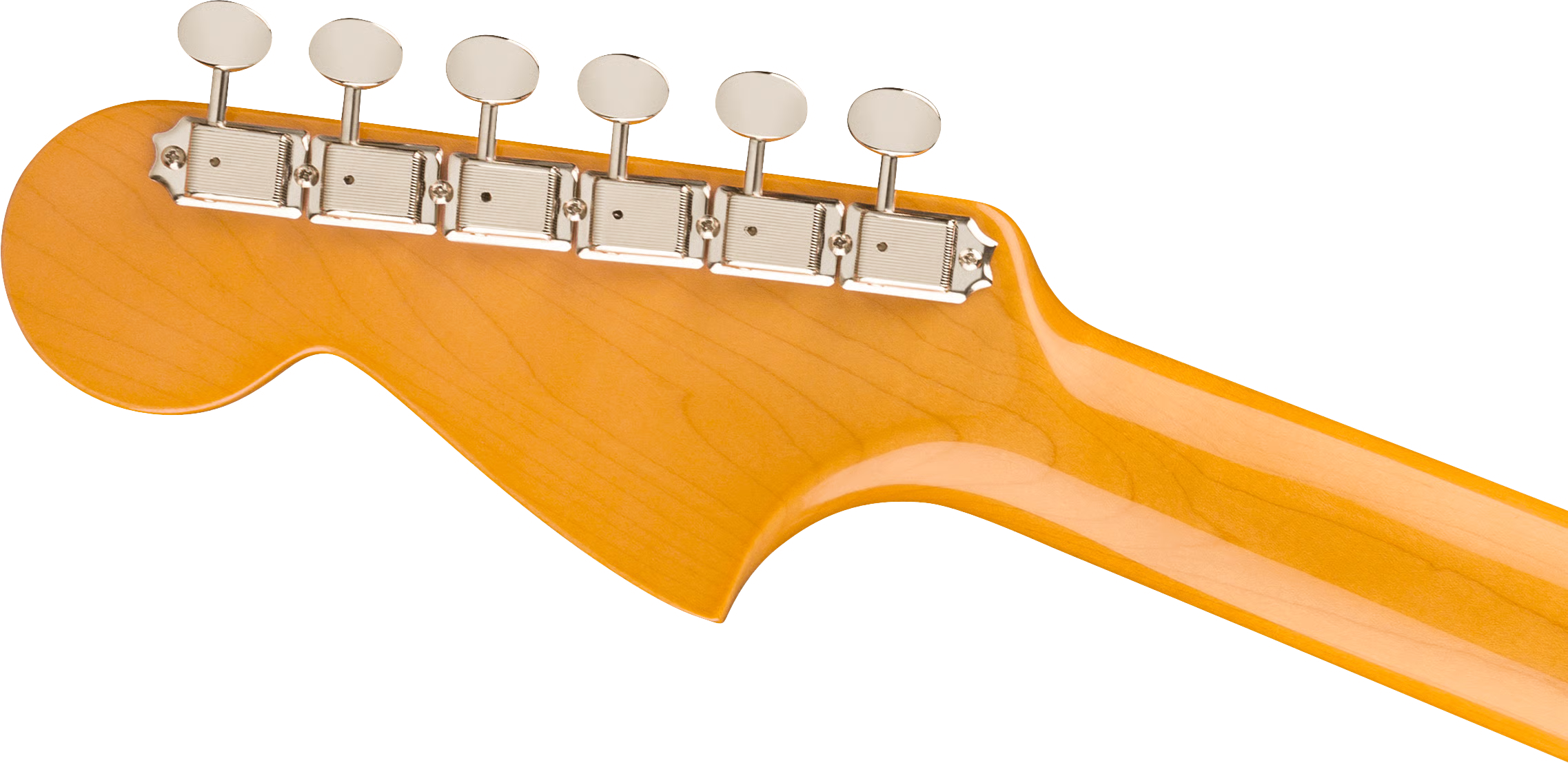 El hardware de esta nueva Jaguar merece una mención especial. Cuenta con un puente híbrido Jaguar con selletas Mustang y un vibrato flotante. Incorpora clavijero de estilo vintage, acordes a su estética. Los trastes también tienen perfil vintage.