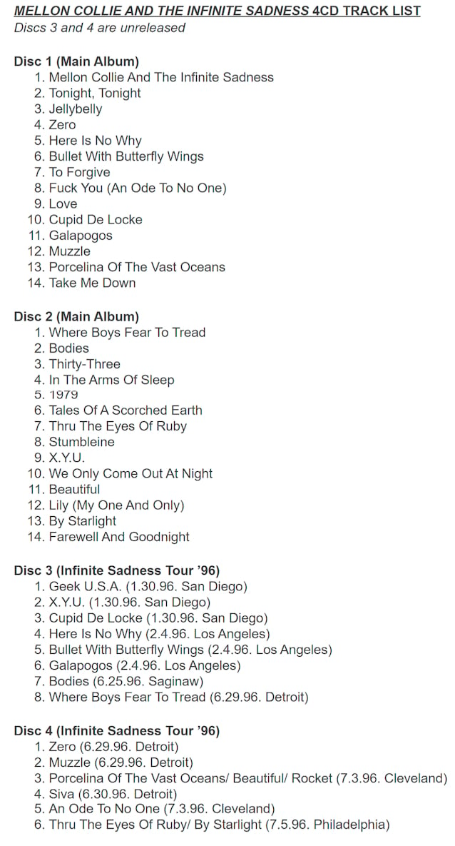 El 21 de noviembre, tres nuevas versiones de «Mellon Collie» estarán disponibles a través de UMe. El álbum y el material en directo estarán disponibles en las plataformas digitales, y todo el audio estará disponible tanto en una edición de lujo de cuatro discos en CD como en un paquete SHM-CD de 4 CD, con nuevas notas escritas por Billy Corgan. La banda también ha creado una caja de vinilos de edición limitada, imprescindible para los fans más fieles, que incluye «Mellon Collie» y el audio de la gira «Infinite Sadness» de 1996 en seis LP, las nuevas notas en un libro de tapa dura, una baraja de tarot personalizada y siete litografías enmarcables, todo ello en un estuche de terciopelo con una bolsa de tela.
