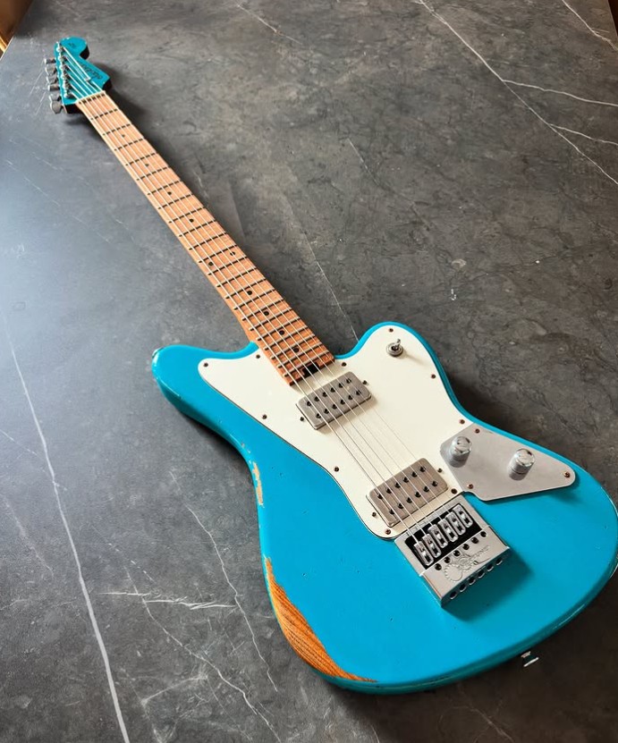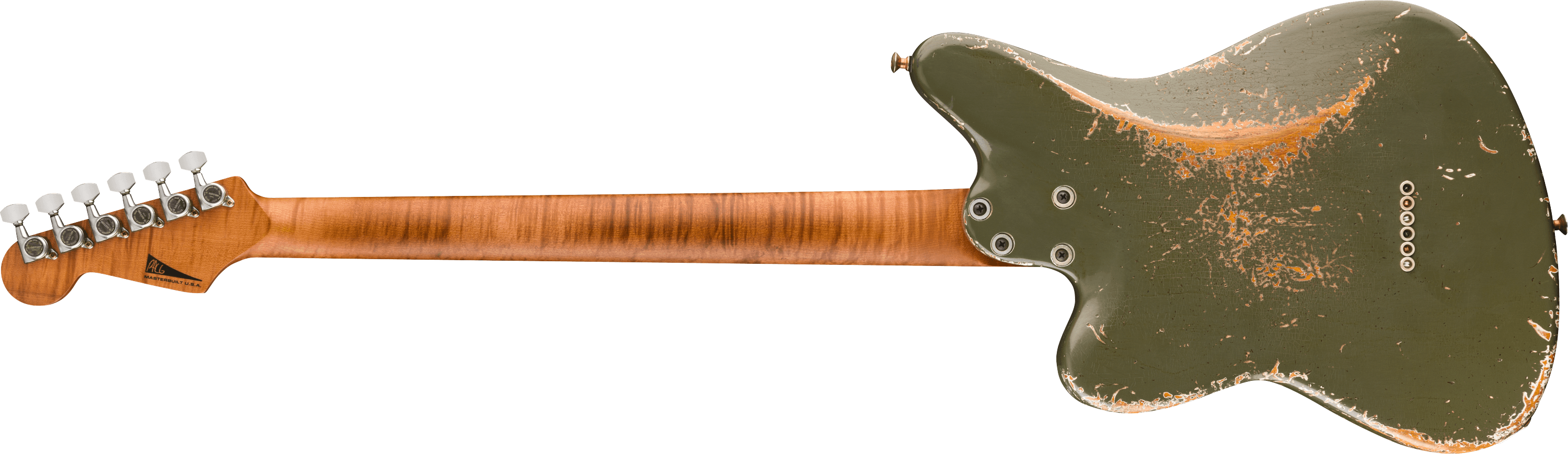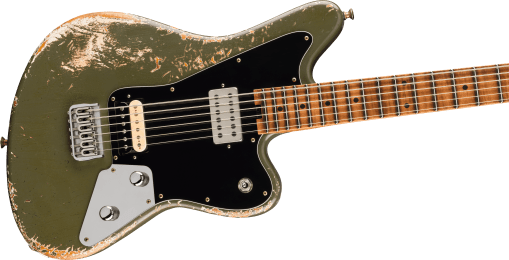 Se trata del modelo verde de Mansoor, recreado aquí con todo lujo de detalles, incluyendo el acabado Army Drab Over White con efecto envejecido. El cuerpo está hecho de fresno tostado, mientras que el mástil y el diapasón son de arce flameado caramelizado.