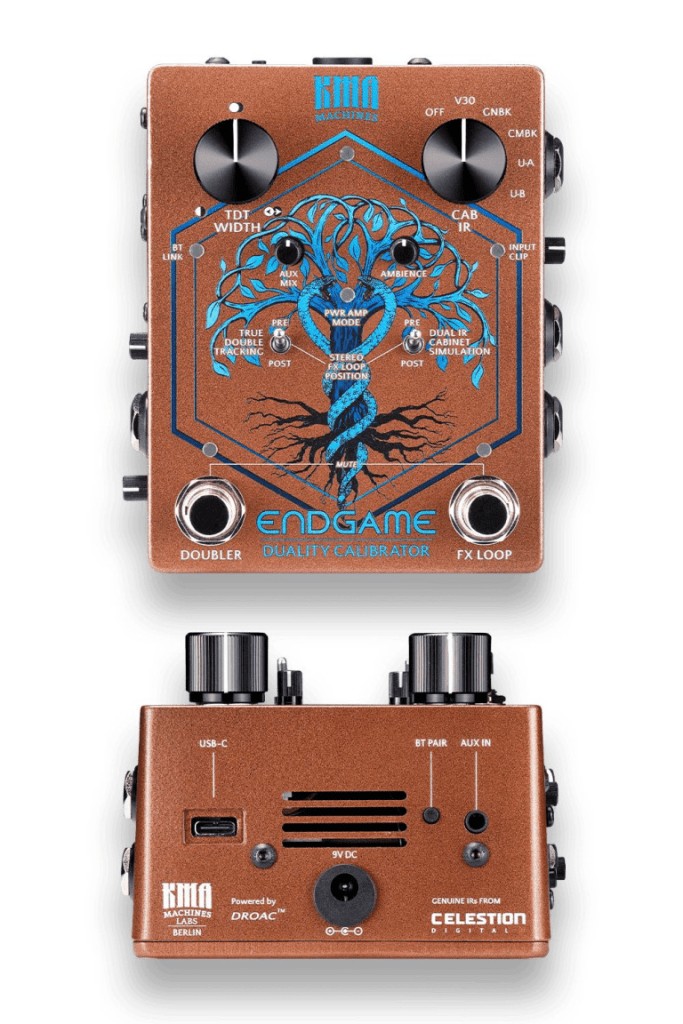 El KMA Machines Endgame Duality Calibrator incluye muchas características en este pedal estéreo, incluido un bucle de efectos estéreo integrado, el duplicador True Double-Tracker patentado por KMA, cabina DUAL IR con simulación de amplificador de potencia, una entrada auxiliar (también a través de Bluetooth), salidas XLR y amplias opciones de enrutamiento.