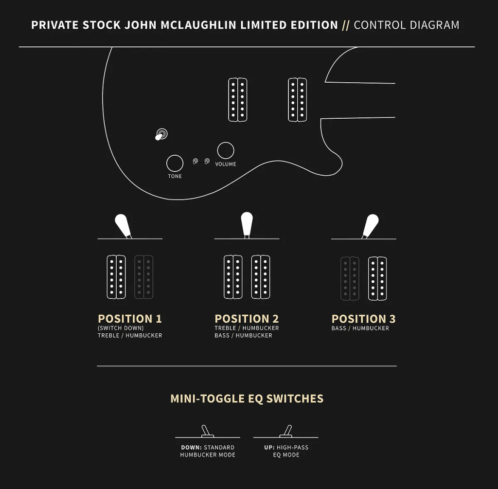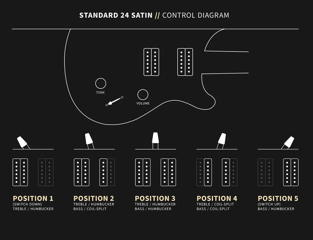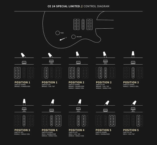 Ambos modelos comparten la configuración electrónica con sus dos humbuckers, controles de volumen y tono y dos miniswitches para conseguir las siguientes combinaciones: