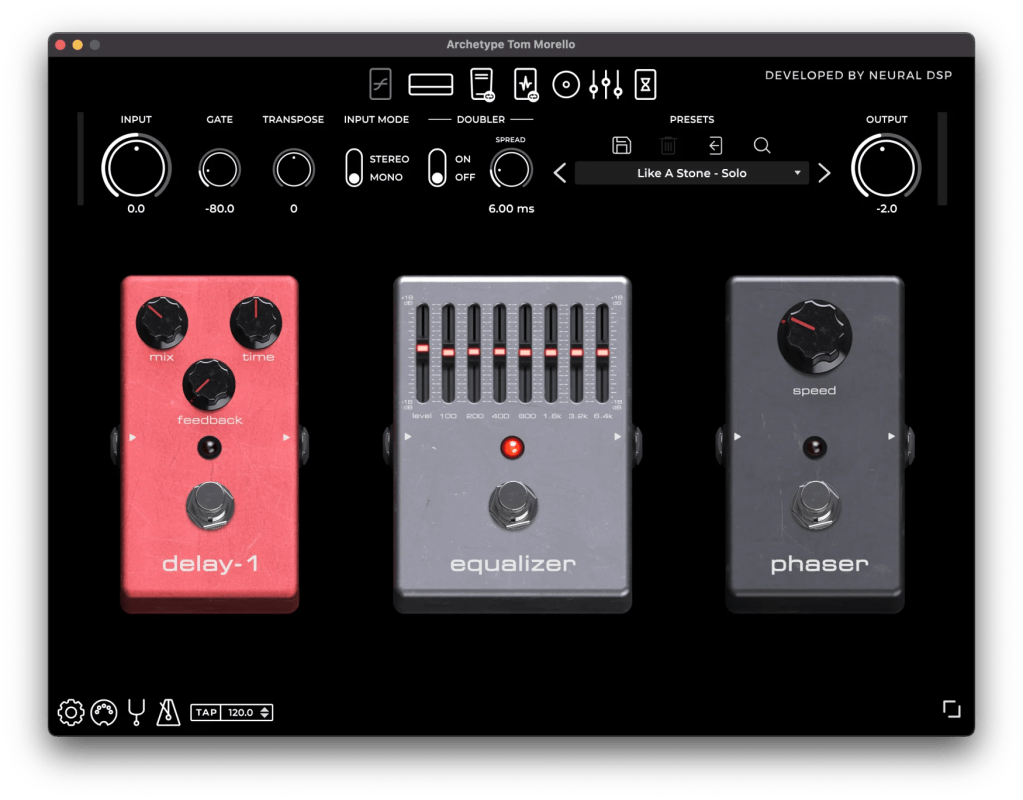 Mientras que la mayoría de los otros complementos de Archetype tienen múltiples simuladores de amplificadores, múltiples efectos e incluso un sintetizador, el de Morello es un solo amplificador y cinco pedales de efectos principales, con algunos extras incluidos. Sin embargo, eso no debería ser tan impactante. Morello ha tocado más o menos exactamente el mismo equipo desde los primeros días de Rage Against the Machine hasta el día de hoy en el escenario. Neural DSP modeló su amplificador específico, un cabezal destartalado Marshall JCM800 de 50 vatios, que tiene su tono literalmente grabado: los controles básicamente no se mueven.