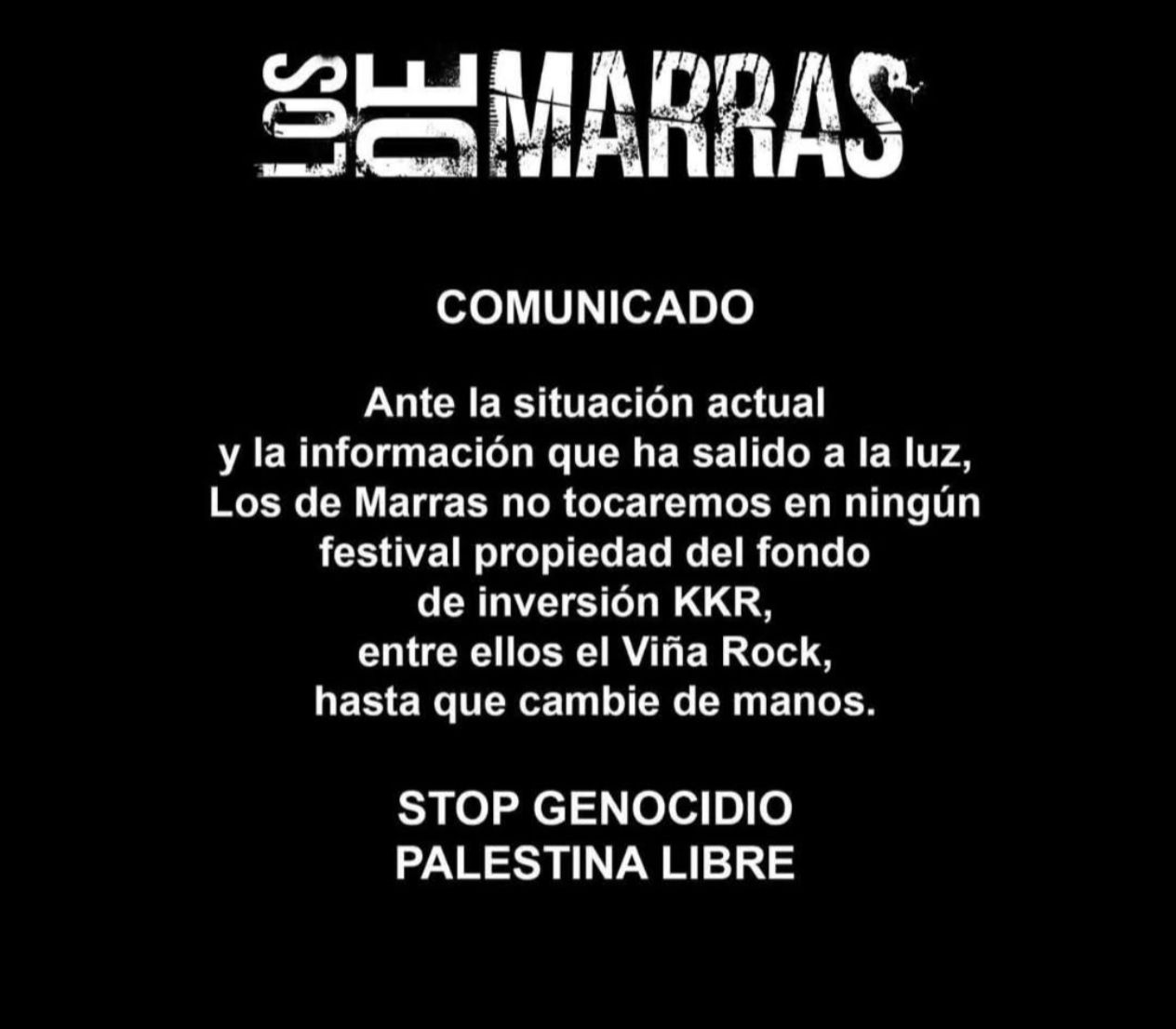 La promotora Superstruct, participada mayoritariamente por KKR, gestiona festivales como el Sónar, Arenal Sound, Resurrection Fest, O Son do Camiño o FIB Benicàssim. En las últimas semanas, numerosos grupos y artistas han decidido cancelar sus actuaciones en protesta por el vínculo con el fondo, al que acusan de financiar, directa o indirectamente, el despojo de suelo palestino a través de operaciones inmobiliarias.