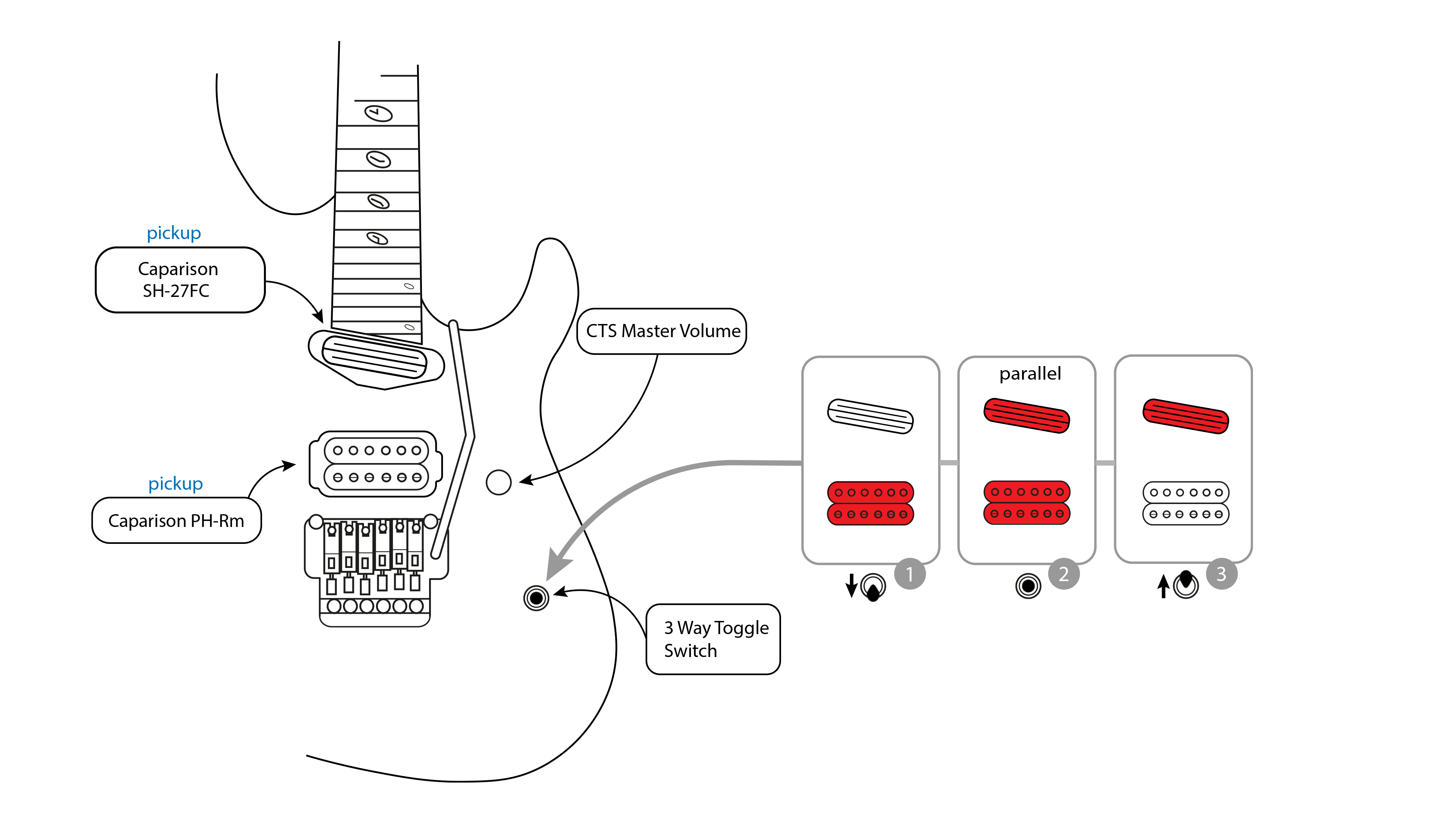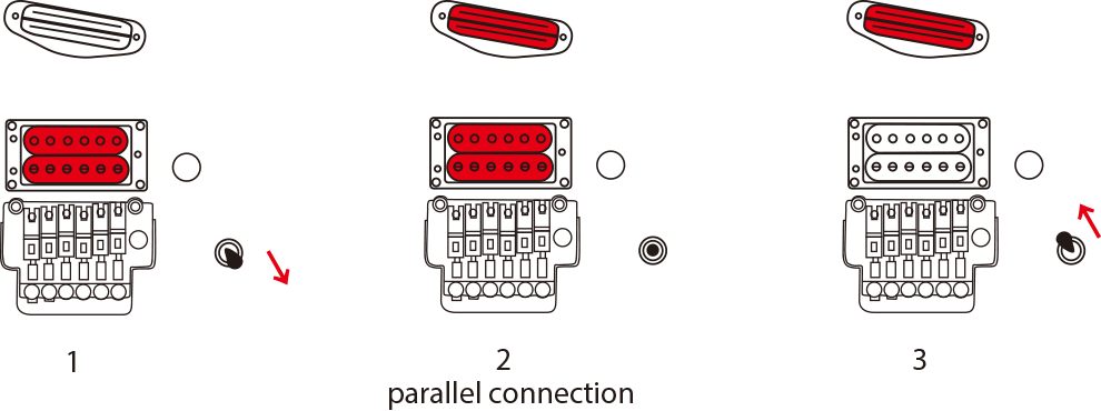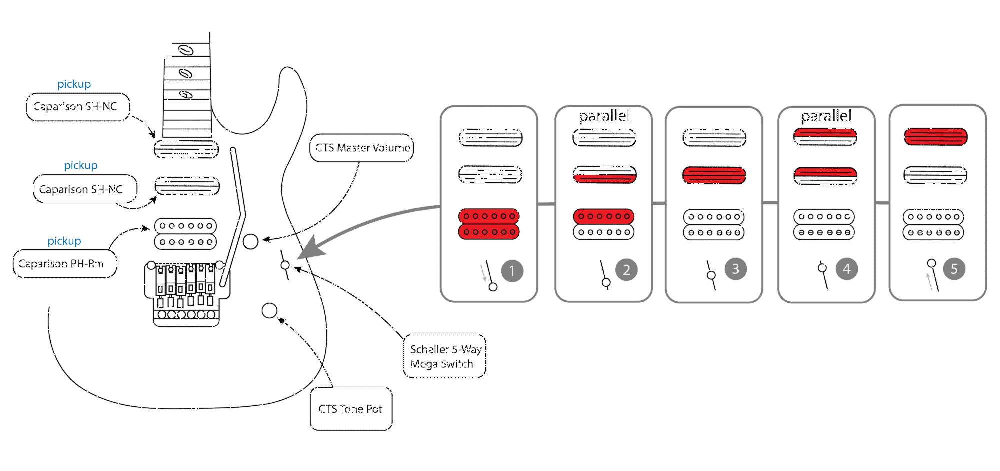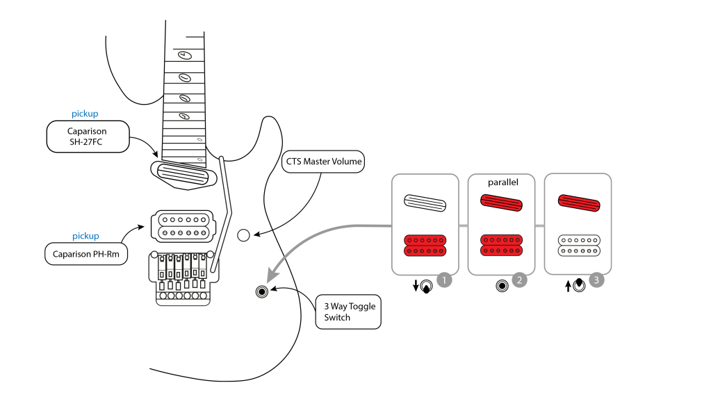 La TAT está equipada con tres pastillas, todas humbucker: dos SH-NC de tamaño single y una humbucker PH-R, que ofrecen una versatilidad tonal excepcional. Para aprovechar al máximo esta configuración única, incorpora un selector de pastillas Schaller Mega Switch «M» de 5 posiciones. A diferencia de un selector de 5 posiciones estándar, este selector permite combinaciones de bobinas que normalmente no son posibles, lo que permite una amplia variedad de sonidos, desde limpios brillantes hasta solos agresivos.