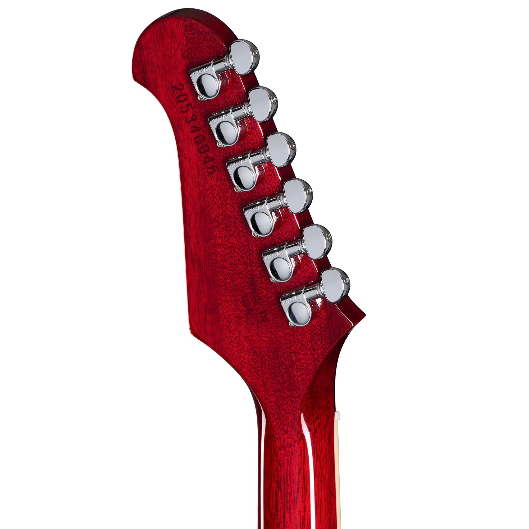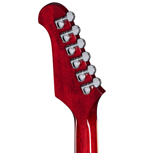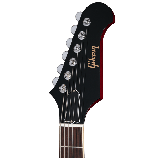 Aquí tienes un clavijero de seis en línea no invertido con Mini-Grover Rotomatics en lugar del clavijero de seis en línea invertido que se encuentran más comúnmente en las Firebird. Para este nuevo modelo 2025, Gibson ha modificado el clavijero original “Platypus” para que haya un tiro de cuerdas recto y, por lo tanto, una mejor estabilidad de afinación.